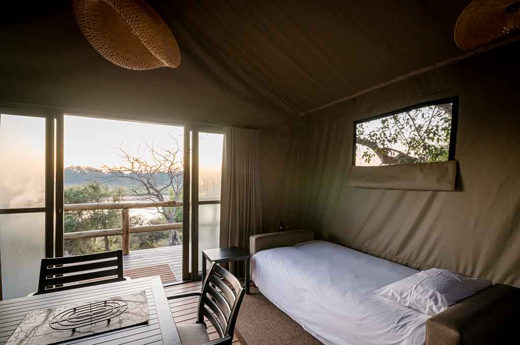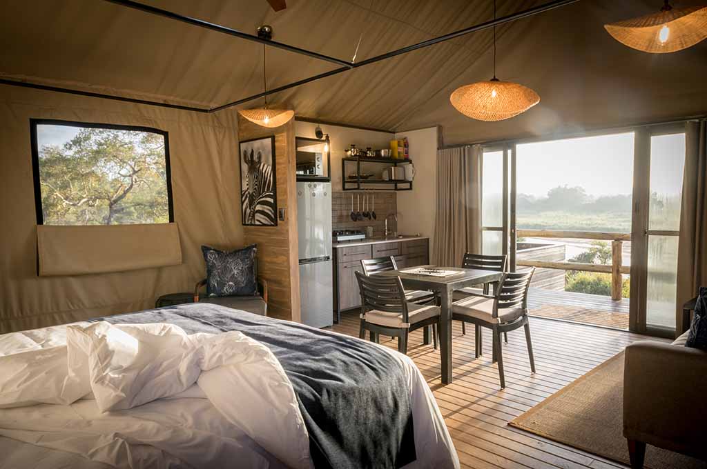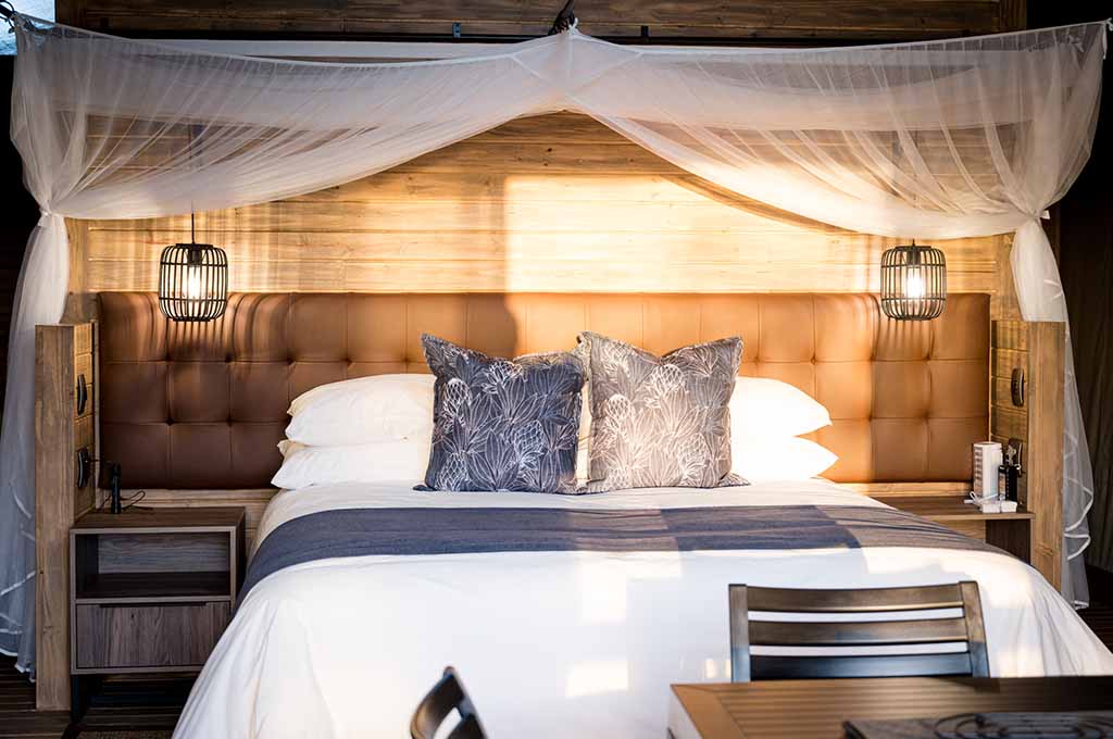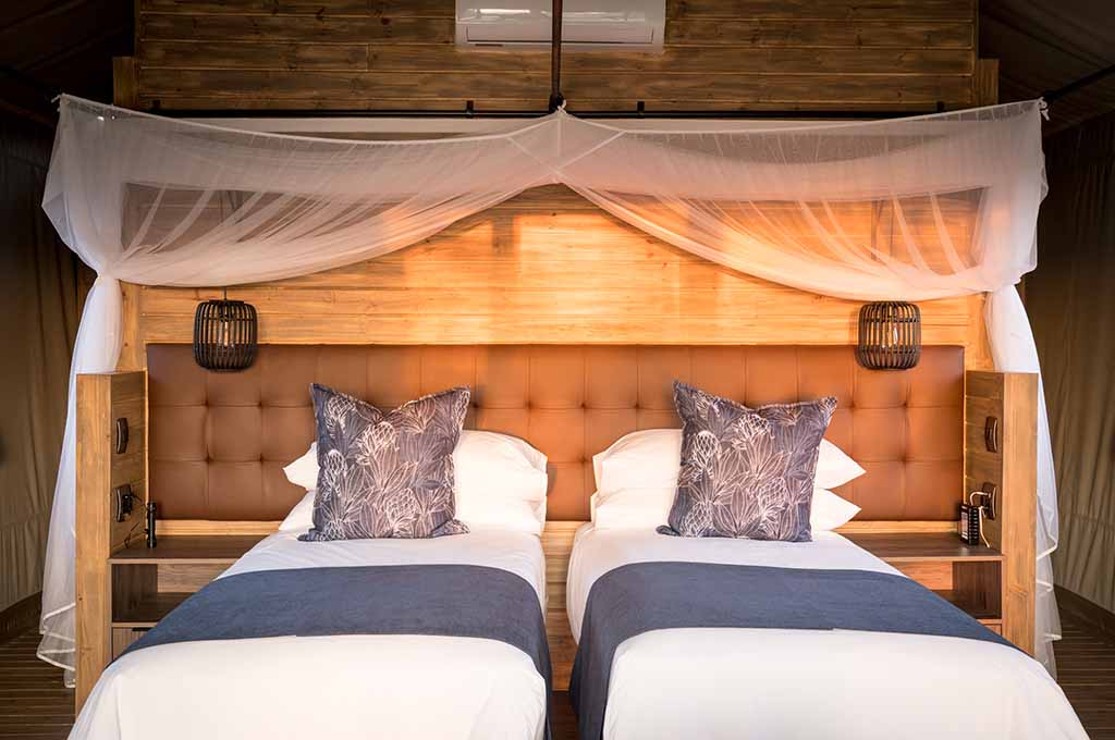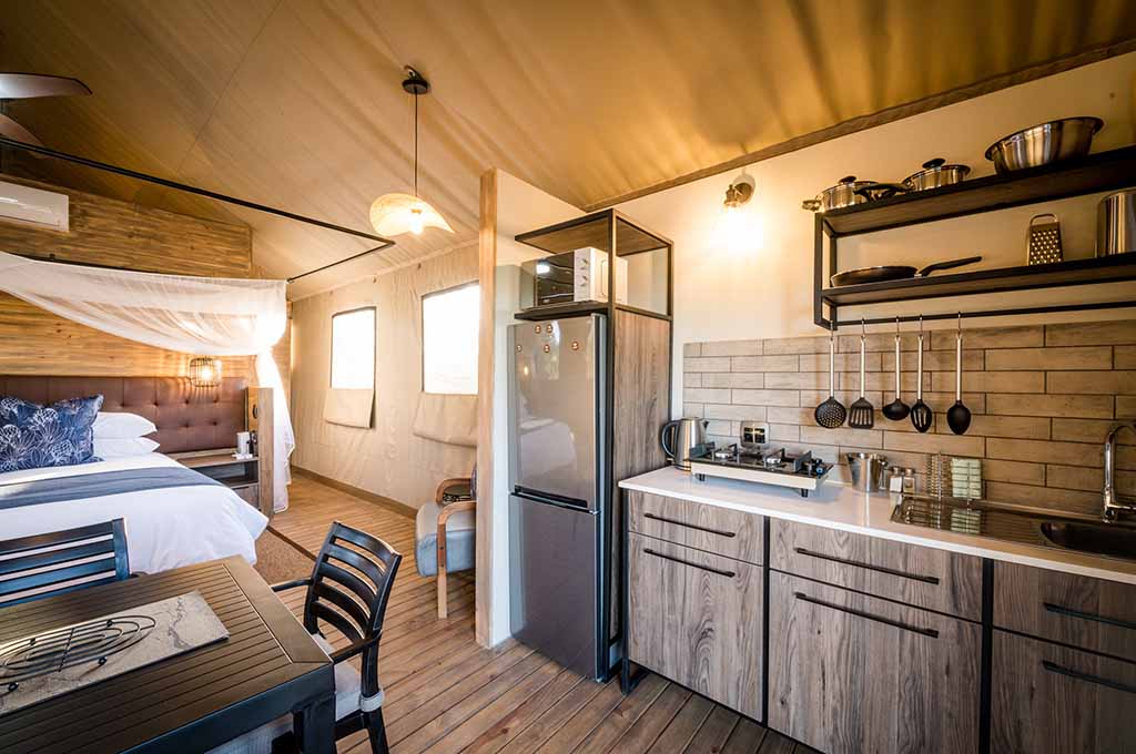 Each tent provides ample space for two adults, offering a choice of twin or double beds. Inside, you’ll discover a well-appointed kitchenette complete with a refrigerator, gas stove, and microwave, allowing you to effortlessly prepare your meals. Step outside onto your private patio and embrace the quintessential South African tradition by relishing a traditional braai under the glistening stars.