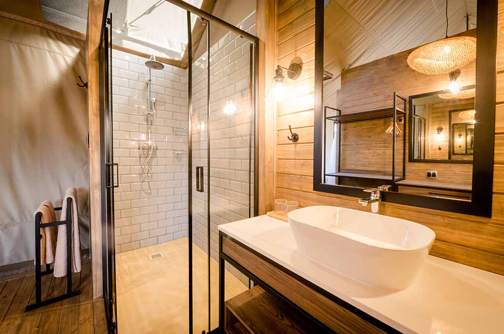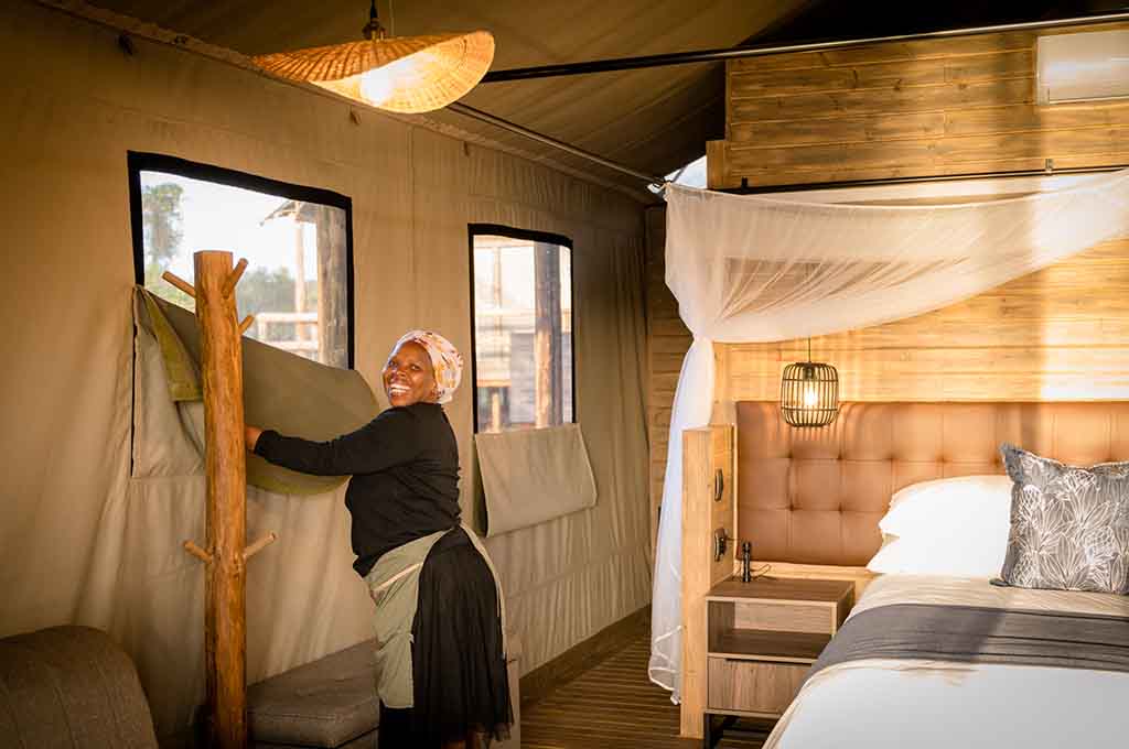 To guarantee your comfort and convenience, we have placed battery-operated lights strategically within your tent. These lights will illuminate your surroundings in the event of any unexpected power outages, ensuring an uninterrupted stay. At Nkuhlu Tented Camp, we prioritize sustainability and have embraced a fully self-sufficient system powered by solar energy and gas. This eco-friendly approach creates a harmonious environment for our esteemed guests.
